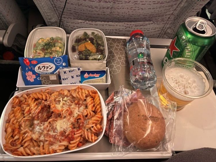 離陸から約2時間後に機内食が配られました。日本時間ではもう深夜2時…。こんな時間に食事してしまうのも旅行中ならでは!と言い聞かせて完食をし、すぐに就寝しました。