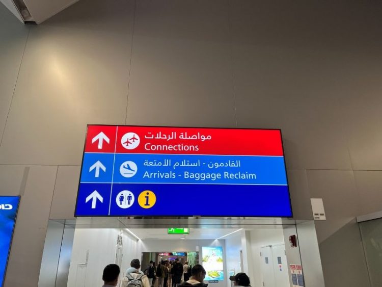 無事に着陸!遅延もなくオンタイムでの到着でした。ドバイ空港では、ひたすら「Connections(コネクションズ)」の赤い看板を目指して進みます。道なりに進むとまずは手荷物検査がありました。羽田で搭乗前に購入した1リットルの水を持っていましたが、そのまま通れました。