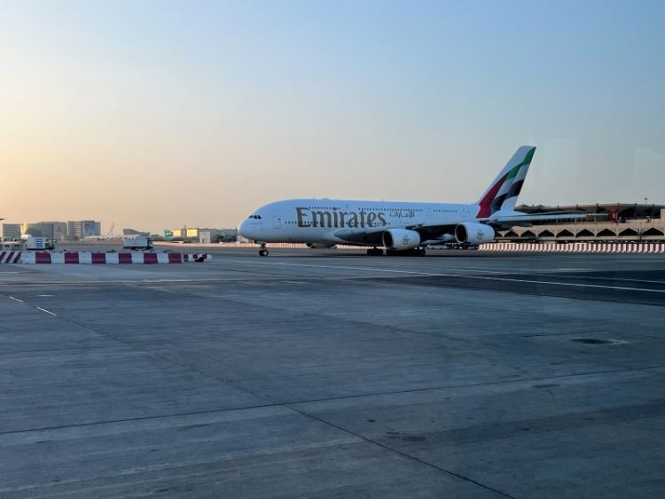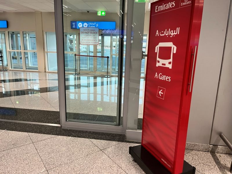 手荷物検査を終え、出発ゲートへ向けて移動開始!この日の出発のAゲートまではバスで移動しました。乗り場へ向かい、バスの乗車時間は約20分間。間近でエミレーツ航空の機体を見学ができて楽しかったです。