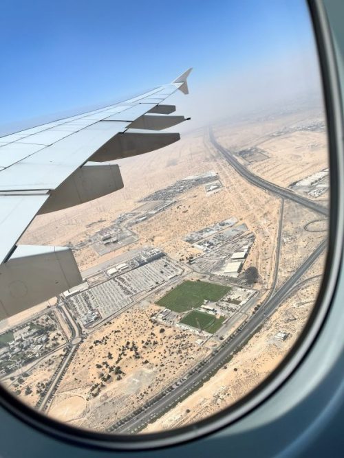 ドバイ~モーリシャス間は窓側の席を選びましたが、これが個人的には大正解!離陸してしばらくは日本では見ることのできない広大な砂漠の景色が続きます。フライト時間は約6時間半ありますので、お手洗いへの行きやすさを考えると断然通路側がおすすめですが、上から砂漠を見てみたい方はぜひ窓側の座席も試してみてください。