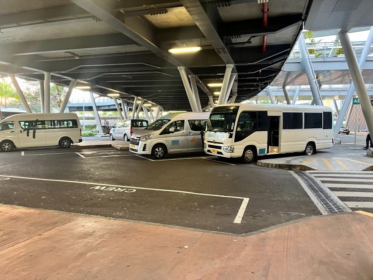 入国審査を終え、自分のスーツケースをピックアップして外に出ると、各ホテルや現地手配会社ごとのカウンターが並んでいます。弊社ではご出発前に空港マップをお渡ししていますので、記載の指定カウンターへ向かっていただきます。空港からコンスタンス ベル マール プラージュまでは車で約60分の距離でした。まっすぐな高速道路などはなく、海岸沿いのうねうねとした道を進んでいきますので車酔いをされる方は酔い止めを飲むのがおすすめです。
