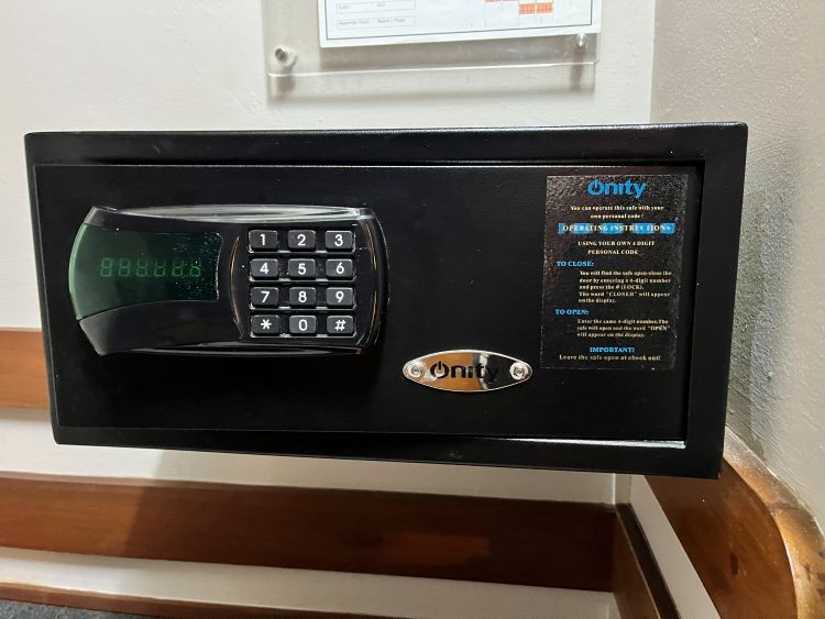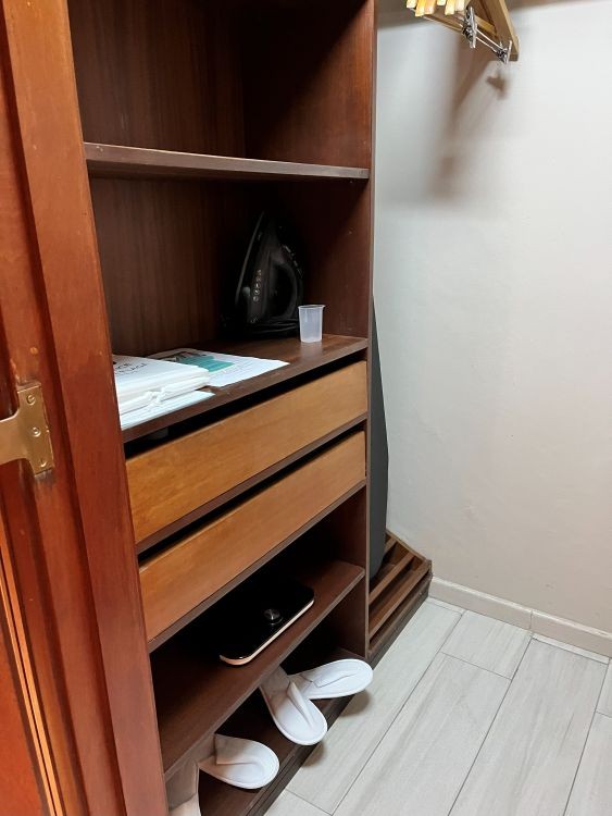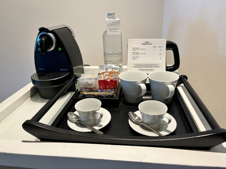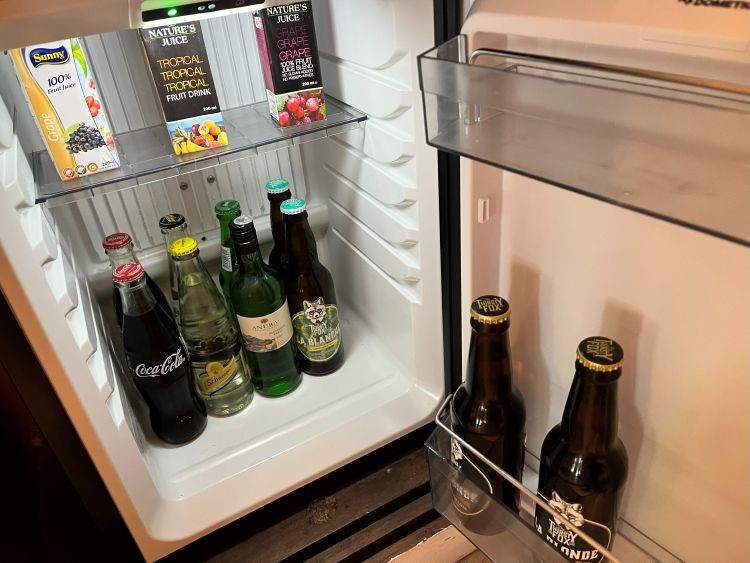 バスローブとスリッパ、セーフティボックス、コーヒーメーカー、ポッドなどのアメニティの用意があります。お部屋の冷蔵庫にはビールやソフトドリンク類が入っていました。