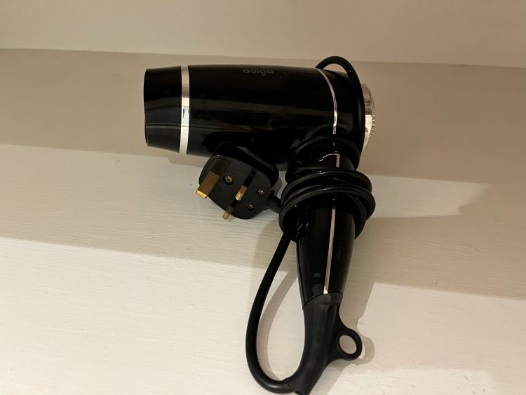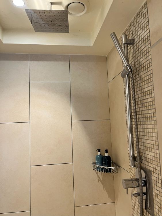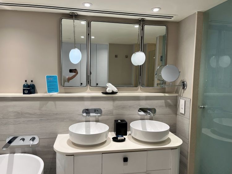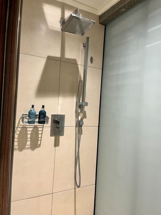 固定型と可動式の両方のシャワーを備えたシャワーブースと、バスタブがあります。洗面台は2つあり、ドライヤーも風圧はじゅうぶんでした!