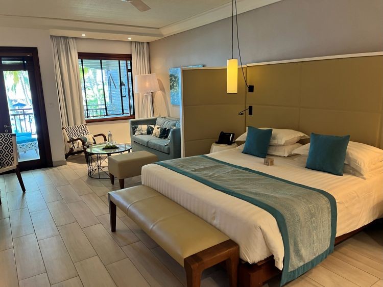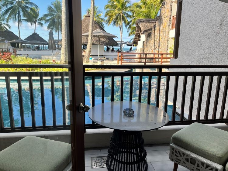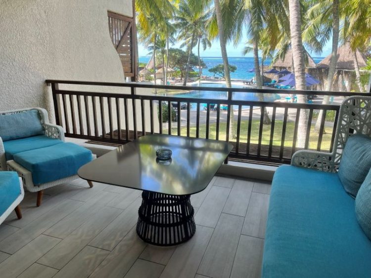 全室大きなテラスかバルコニー付きで、ソファーとテーブルが設置してあります。景観は2種類あり、ビーチフロントの客室(53室)とプールに面した客室(96室)があり、客室料金は1室1泊あたり2万円前後ビーチフロントのお部屋のほうが高くなります。