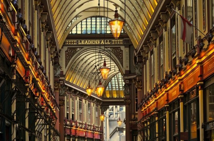 美しいヴィクトリア朝様式の建築が印象的で、天井の装飾や石畳の道は映画の世界そのもの。現在もおしゃれなパブやレストラン、ブティックが軒を連ね、ロンドンの歴史ある商業エリアとして活気に満ちています。