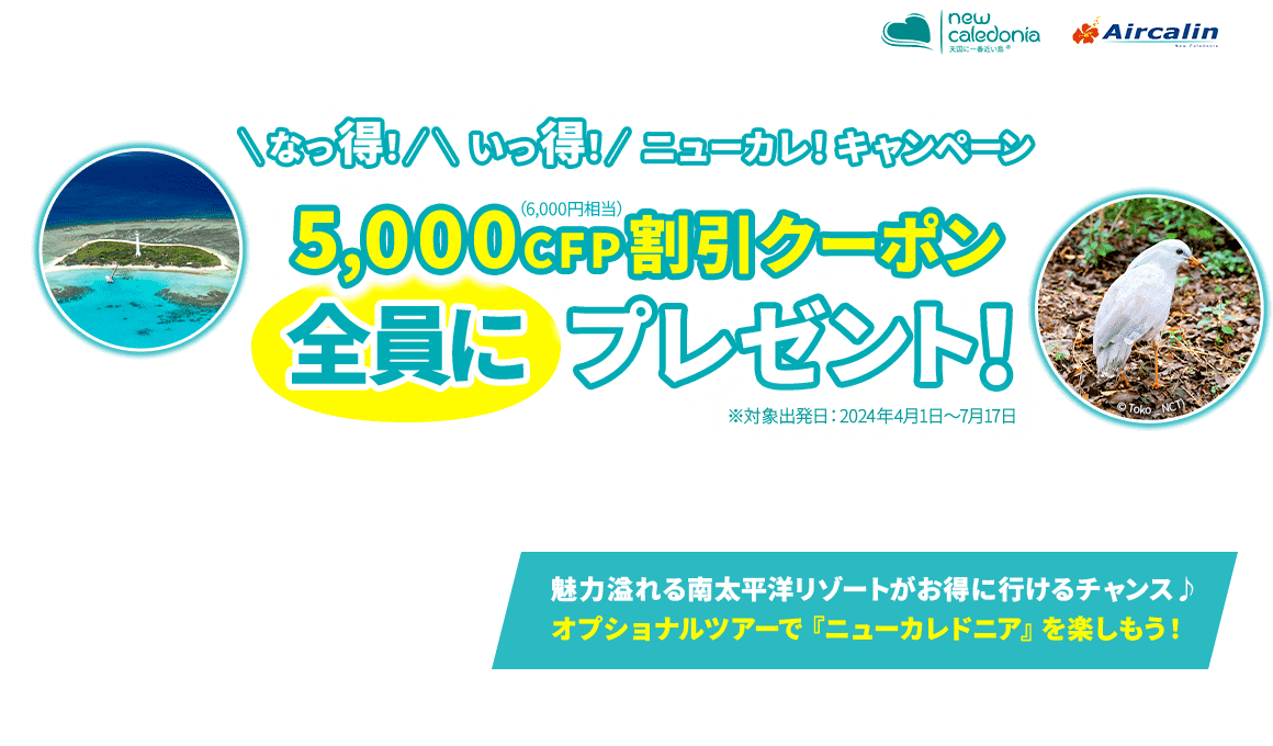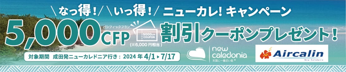 簡単な手続きで5,000CFP(6,000円相当)の割引クーポンをゲットして、オプショナルツアーやお買物利用でニューカレ旅行をお得に楽しもう♪
