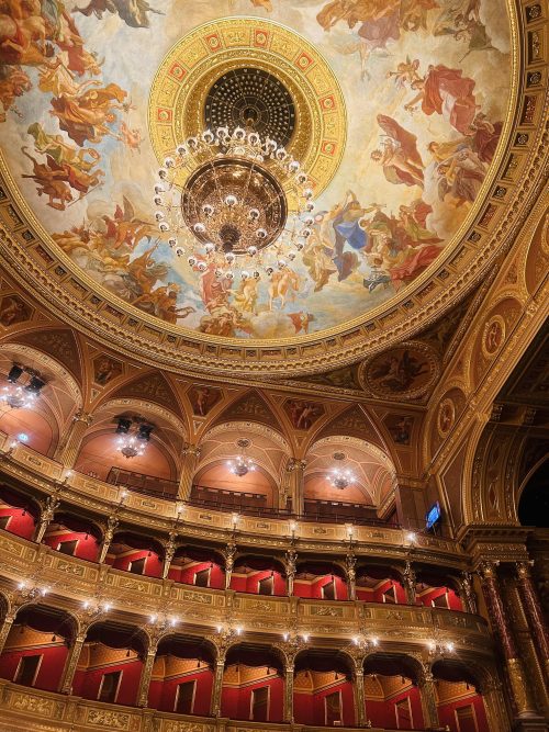 次にハンガリー国立歌劇場を見学した後、カフェで伝統的なスイーツのチムニーも食べることができ、ブダペストの名物料理を食べられたと満足しています。ハンガリー国立歌劇場は、ブダペストに行くならぜひここも訪れようと決めていた場所。天井画がとても素敵でした。