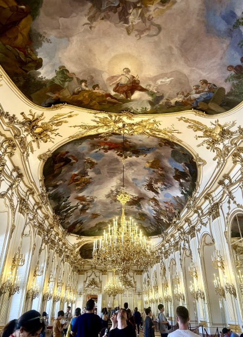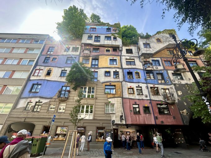 ウィーンのシンボル「シュテファン大聖堂」ではエレベーターで塔にも登りました。シュテファン大聖堂は、外観の建築物としての美しさの上に、中のステンドグラスの美しさ、教会としての装飾の見事さ、塔の上から見る景色と、たくさんの見どころがある素敵な観光スポットでした。次に、今回私の旅に付き合ってくれた妹が唯一希望した観光場所「フンデルトヴァッサーハウス、クンストハウス」へ。個性的な建築に緑豊かなカフェ。教会や宮殿といった観光地とは違った魅力のある所でバラエティに富んだ観光になってよかったと思います。そしてシェーンブルン宮殿の鏡の間に感激。