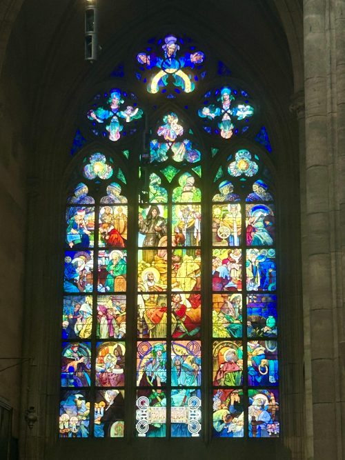 その後、優先入場チケット付きの英語ガイドツアーを予約して、ミュシャのステンドガラスを見に聖ヴィート教会へ向かいました。 ここもとても人気がある観光名所なのでしょう。チケット売り場も、教会に入場するにも列ができていました。ツアーの全体に向けた説明の後に、自由行動となり、教会へ入ってステンドガラスを無事見ることができました。ミュシャの絵も好きだったので、チェコに来てミュシャの作品を見ることができたのは良い思い出になりました。