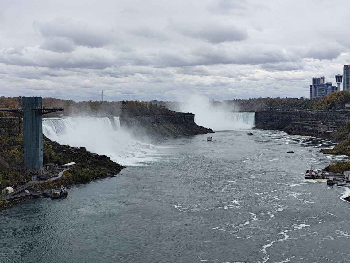 朝は9時半からナイアガラ・クルーズへ。残念ながら雨が降っていましたが、滝の近くに行くと濡れるので「同じだよね」と気にせず出発しました。クルーズ自体は20分ほどでしたが、滝壺の近くまで進む迫力は別格。私は「せっかくならより近くで味わいたい!」と思い、船の2階のいちばん前へ行ったのですが、しぶきが想像以上で、私は目を開けていられないほどでした。これから行かれる方は、ゴーグルや水中メガネがあるとかなり快適だと思います。
