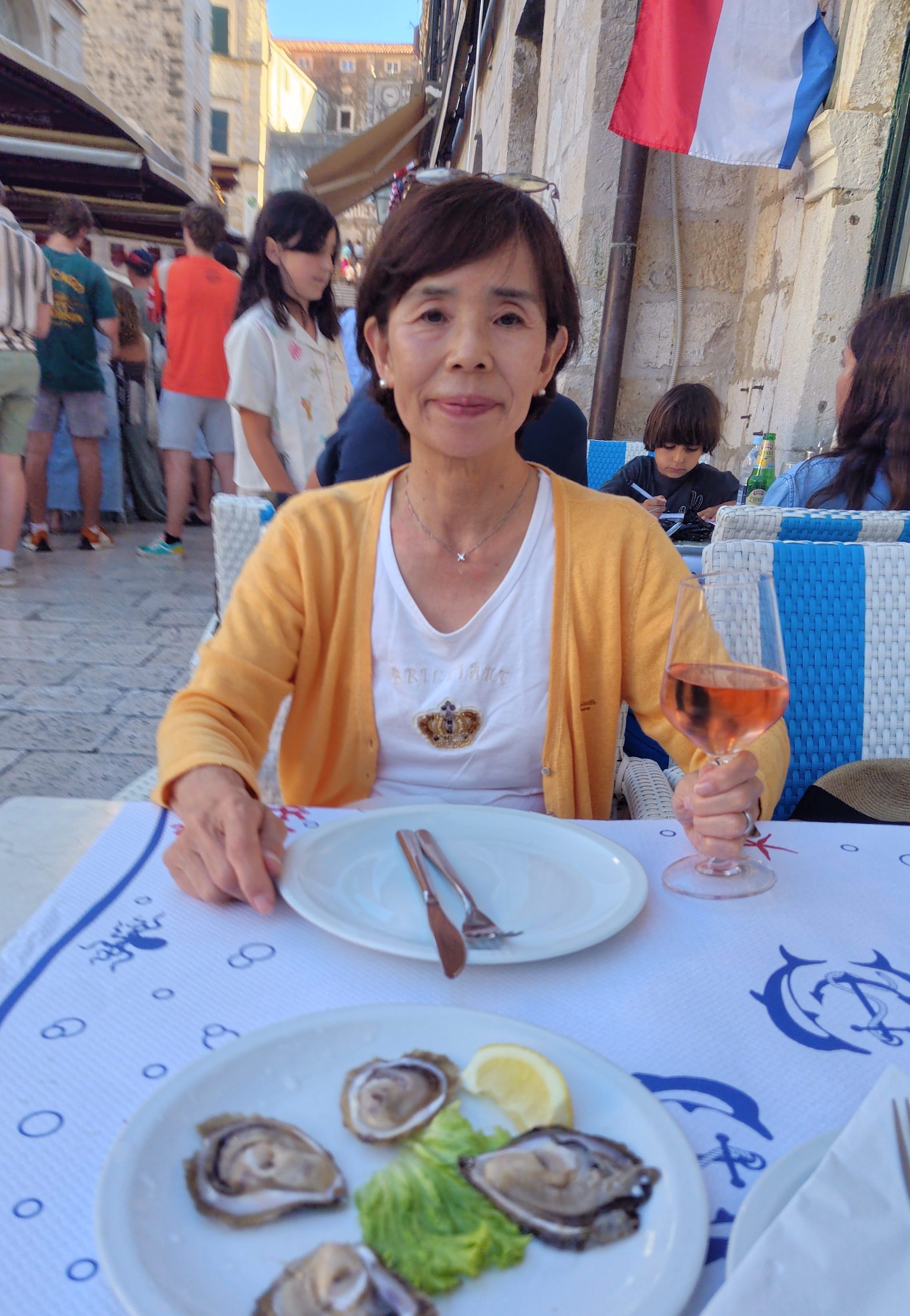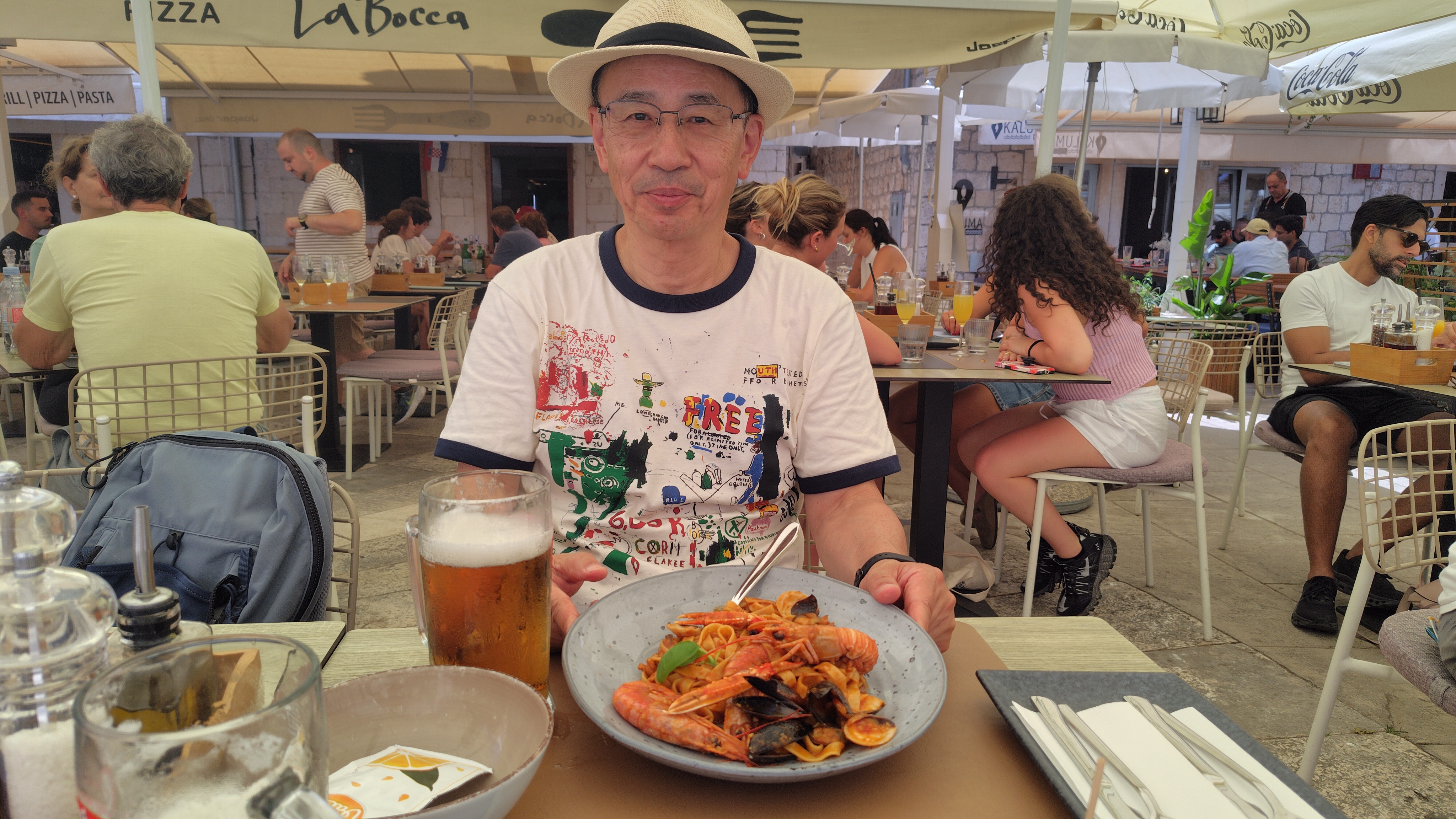 その後、海岸沿いのレストラン「Šperun eat and drink buffet」でランチ。迷路のような街を歩き回り、昨年この地を訪れた長女から紹介されたレストランです。こちらでイカフライやムール貝等をいただきました。とても美味しくビールがすすみました。天気も良くて観光客が通りを行きかう光景が楽しく、長い時間滞在しました。