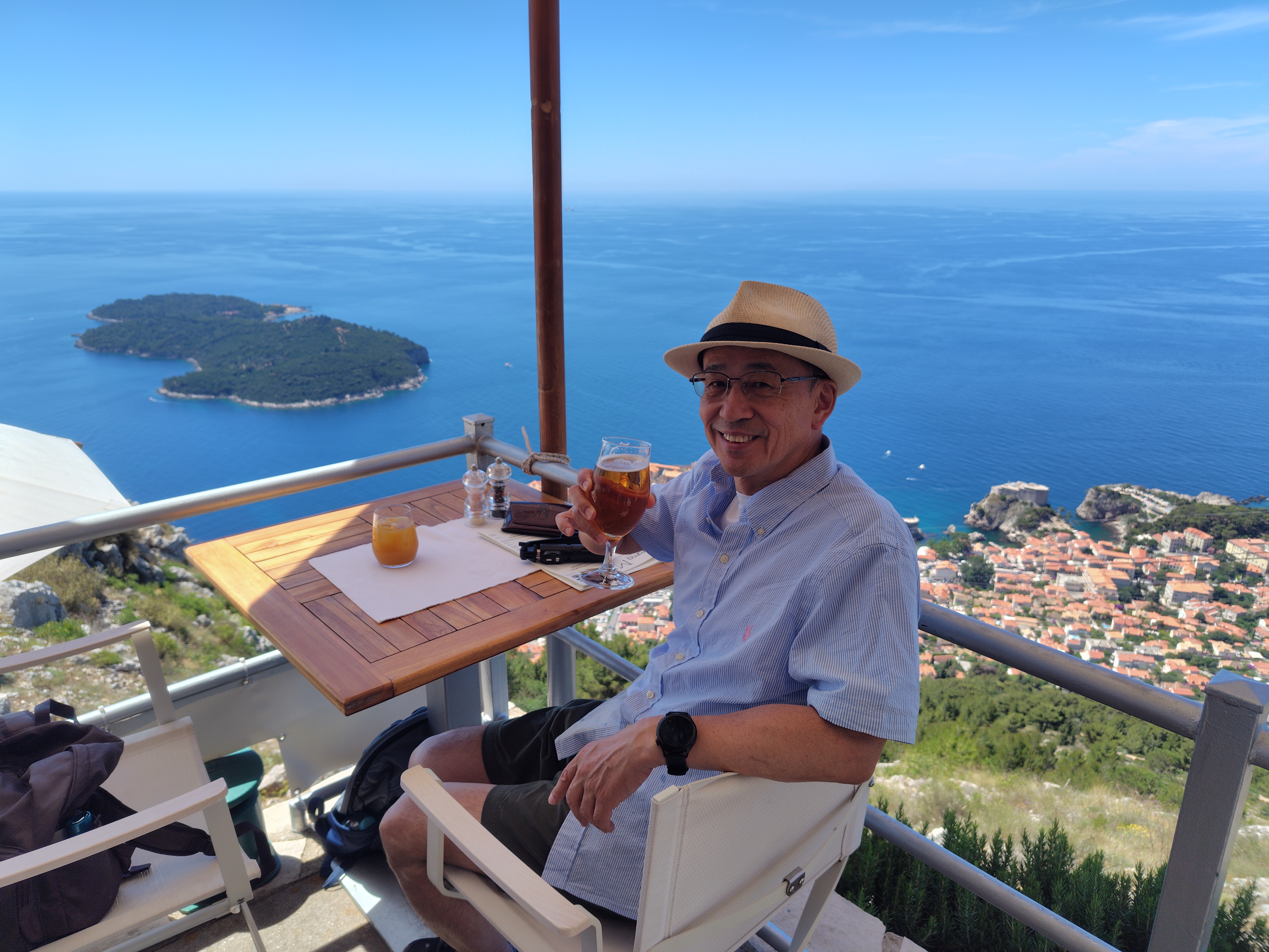 翌日はロープウェイでスルジ山に登りました。スルジ山の山頂に位置する「パノラマレストラン」を予約していました。美しい景色を眺めながらのワインとビールは、最高に美味しかったです!青い空、青い海、オレンジ色の家屋の屋根など、まさしくジブリの世界で時間の経つのも忘れ、心ゆくまでゆっくり過ごしました。好きな場所で心ゆくまで、お酒を愉しみながらゆっくり過ごす!これこそ個人旅行の醍醐味ではないでしょうか?素晴らしい経験でした。