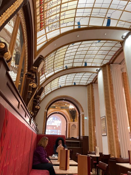 この後、近くのカフェ「カヴェールナ オベツニー ドゥーム」で少し休憩。プラハのカフェは素敵です、このカフェはミュシャの絵画があったり、天井も高く、値段もお手頃でおすすめです。