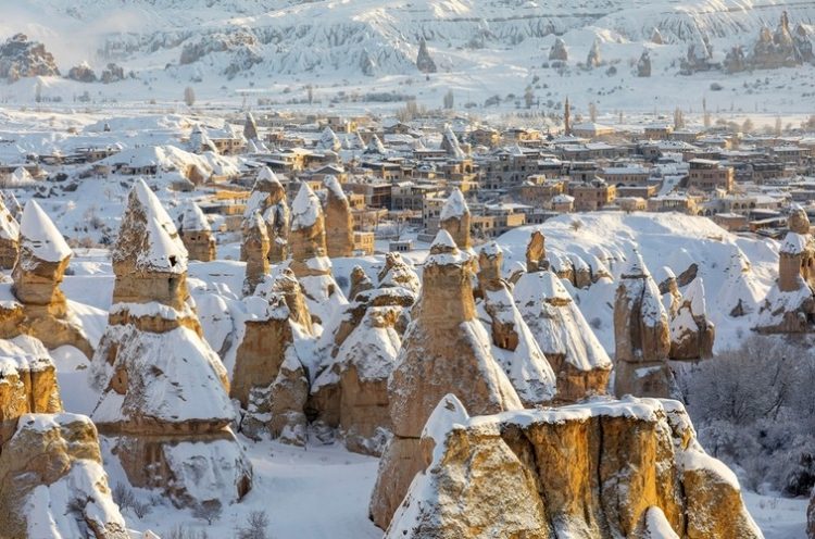 カッパドキアの冬は非常に寒く、気温はマイナスになることもあります。しかし雪化粧した奇岩群は息をのむ美しさで、夏とはまったく異なる幻想的な景色が広がります。