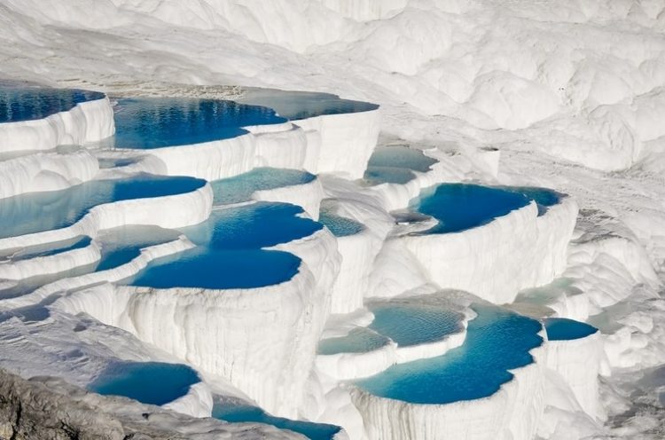パムッカレ石灰棚(所要時間:1〜2時間) 真っ白な石灰棚と青い温泉水のコントラストが美しい世界遺産。裸足で歩きながら写真撮影を楽しめます。
