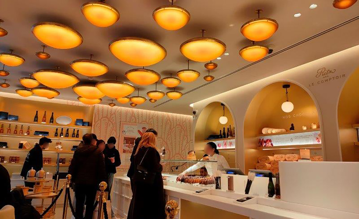 お買い物後は、絶対に行こうと計画していたリッツ パリのカフェ「リッツ パリ ル コントワール」に行きました。リッツ パリの裏側の通りにあります。こちらのお店もコロナ禍の2021年にオープンしたので初めて訪れました、お洒落な雰囲気です。店内は地元の方でいっぱい。パリコレの時期だからか、リッツに有名人が来るようで入り口には人だかりができていました。
