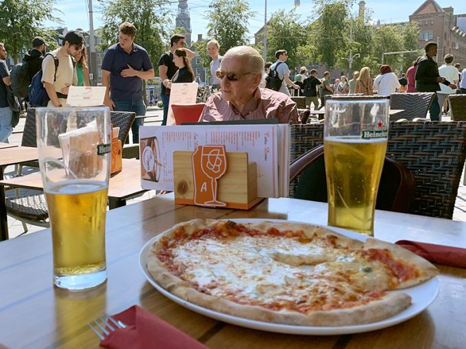 その後、すごくオシャレなチーズ屋さんがあったので入ってみたら、全部試食できるお店でした。オーナーとお話しながら、おすすめのチーズをひとつ買って帰りました。その後、ホットドックを食べ歩きして、今度はレストランに入って、テラス席でハイネケンとピザを食べてひと休み。こんなかんじでアムステルダムに3〜4時間滞在してから、今度はユーロスターでブリュッセルへ移動しました。