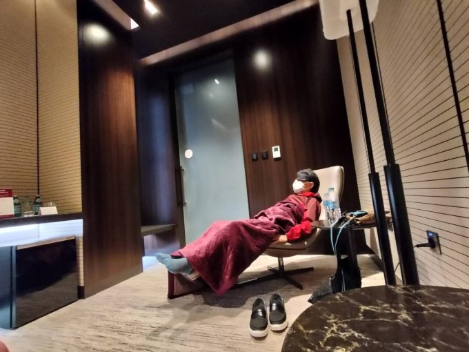 成田を夜に出発しました。利用したカタール航空のビジネスクラスは素晴らしく、特にQスイートは座席が広くフルフラットになり快適でした。食事はフルコースで、メニューからオードブル、メイン、デザートまで注文して持って来てくれ、まるでレストランで食べているようでした。乗り換えは余裕があったため、ドーハ・ハマド空港のラウンジではQUIETルームでゆっくりしたり、寿司やアイスなどをいただきました。