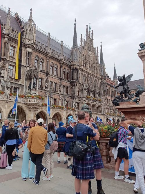 続いて、からくり時計が動く12時に合わせて新市庁舎を訪れると、すでに多くの観光客が集まっていました。また、この日はUEFA EUROのスコットランド戦があったため、スコットランドのサポーターも新庁舎前に集まり、歌を歌ったりして大賑わいで楽しかったです。