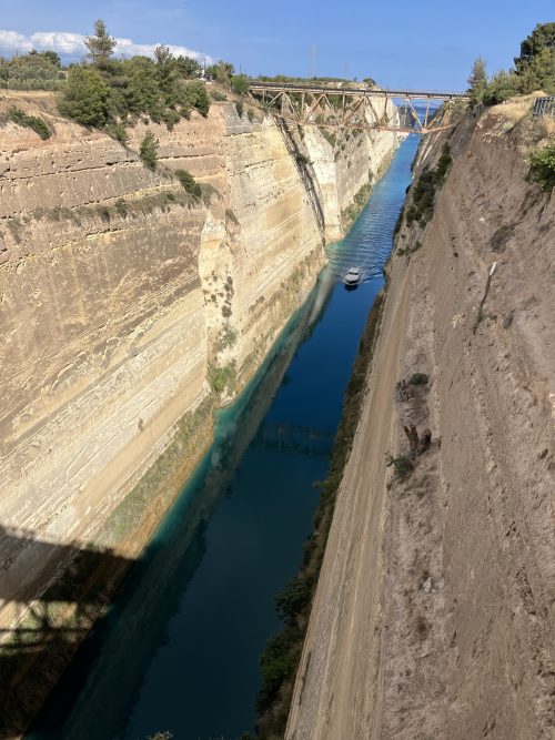 滞在の三日目には、ペロポネソス半島を訪れる現地グループバスツアーに参加しました。最初に訪れたのはコリントス海峡。絶壁の崖の間を流れ、小さな船がようやく通れるほど幅が狭い海峡です。崖の上を通る橋から見下ろす海峡の景色は壮大で、まさに絶景を楽しむことができました。