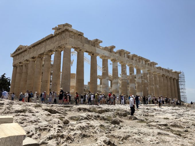 滞在最終日は、世界遺産アクロポリスの観光へ。市内の至る所から見ていたアクロポリスですが、間近で見るとすごく大きく圧倒されました。パルテノン神殿の他にも、エレクティオン神殿などの遺跡を見学。神殿を形作る白い材料が思いの外つるつるとしていて美しかったのが印象的でした。丘の上からは、アテネ市内の美しい景色も一望できました。