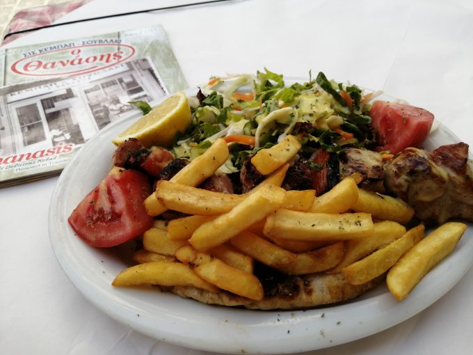 その後、O Thanasisというお店で、旅最後のランチをいただきました。Googleの評価も非常に高い人気店で、「ギロ」というギリシャ料理をチョイス。仔牛の串焼きのお肉、ポテト、サラダのセットで、サンドできるパンがついてきます。ギリシャの料理は、トルコ料理に近く、さりげなくスパイスが効いていて、シンプルな味付けでとても美味しかったです。