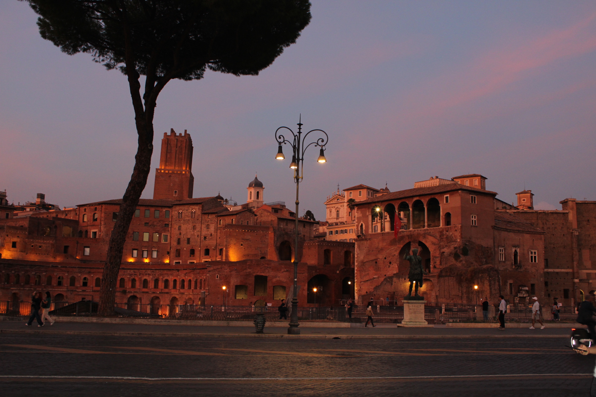 そこからベネチア広場に向かい、夕暮れのフォリ インペリアリ通りをコロッセオに向かって散策。ライトアップされた遺跡に囲まれた大通りになんとも不思議な旅情を掻き立てられました。今回の旅で、最も印象に残った場所です。フォロ・ロマーノの向かいのトラヤヌス帝の記念塔などの遺跡群を見ることができ、ローマ遺跡好きの主人は大感激。フォロ・ロマーノより、フォリ・インペリアリ通りにとても興味を示し、両サイドの遺跡群にものすごく感動していました。