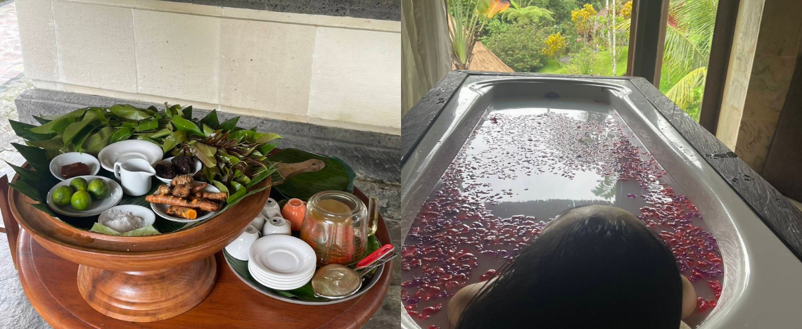 朝ヨガ、バリ伝統ダンスレッスン、ジャムウ作りアクティビティ、スパ