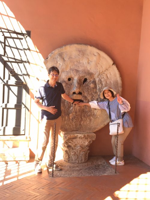 その後はナヴォーナ広場近くのカルボナーラで有名な「GRAPPOLO D’ORO」でランチ。カルボナーラはとても美味しかったです。「カンポ・デ・フィオーリ広場」で開かれる市場では、食品から革製品まで名物が一通りそろっており買い物好きにはたまらない場所でした。最後に「真実の口」へ歩いて向かいました。行列ができていましたが20分ほど待って写真を撮れました(嬉)! 帰りはホテルまでバスを利用。この旅で、もっとバスを利用して観光すれば、歩かずに済んだなと最終日に反省しました。