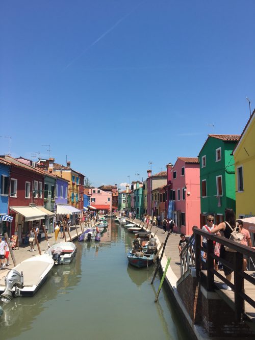 その後、色とりどりの建物がとても可愛い「ブラーノ島」へ!本島から船で約1時間ほどでした。当初1時間の観光を予定していましたが、素晴らしい青空と建物の色がマッチしてどこを見ても美しい写真が撮れますし、雑貨屋さんもたくさんあり、予想以上に長居をしてしまいました。レース編みのショップとガラスショップが交互に連なっており、雑貨を見るのが大好きな妻は、時間も忘れて気になるお店を巡り楽しんでいました。