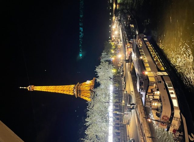 食事の後、セーヌ川沿いを散歩し、エッフェル島を眺めながら夜の散歩を楽しみました。歩きながらパリの街並みを肌で感じることができました。凱旋門もオリンピック仕様になってて、想像より大きくて感動しました!凱旋門は、この旅最後の観光場所だったのでとても心に響きました。