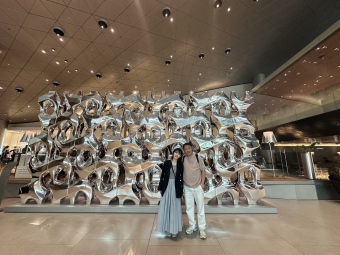 経由地のドーハでは、4時間の待ち時間がありましたが、アル・ムルジャン ビジネスラウンジではシャワーが利用でき、多彩な料理が用意されていました。座席も、ゆったりと配置されたくさんあるので、あっという間に時間を過ごすことができました。クワイエットルームも利用でき、ここだけでも1日を過ごすのに十分なほどの設備。乗り換え場所は少し距離がありましたが、早めに移動しておいたため問題はありませんでした。乗り換え場所までの移動中に、KAWSが手がけた巨大モニュメントがあり驚きました。