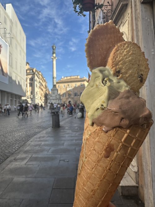 14時頃にローマに到着し、空港から電車でテルミニ駅へ向かいました。ホテルのチェックインを済ませた後は、さっそくホテル近くのサンタ・マリーア・マッジョーレ教会やトレビの泉、スペイン階段など、ローマ市内の観光へ。トレビの泉はとても混雑していましたが、何とか人波をかき分けて写真撮影に成功。スペイン広場近くの、DON NINOというお店でジェラートを食べましたが、観光地価格で8ユーロと少々お高めでした。