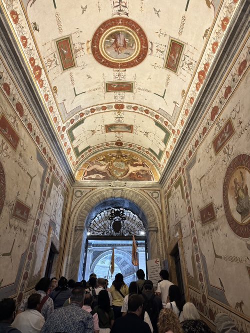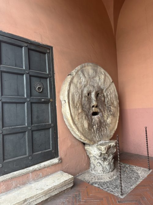 ローマ滞在3日目は、9時半の開始に合わせ、朝からバスで真実の口に向かいました。開場15分前には既に10人ほどが並んでいましたが、その後次々と人が訪れ団子状態に。日本人ツアーのガイドさんが列を整理してくれました。それでも割り込んでくる方もいてびっくりしましたが、おかげでスムーズに写真撮影ができました。帰り際には外国のツアー参加者で行列ができていたため、早めに行っておいて良かったです。