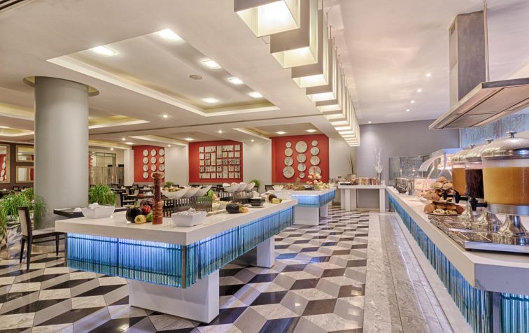 朝食は4階のレストランでいただきます。窓際の席に座れば窓一面に地中海。なお、料理内容は新型コロナウィルス流行後、ビュッツフェではなくオーダー制のアラカルトやセットに切り変えました。