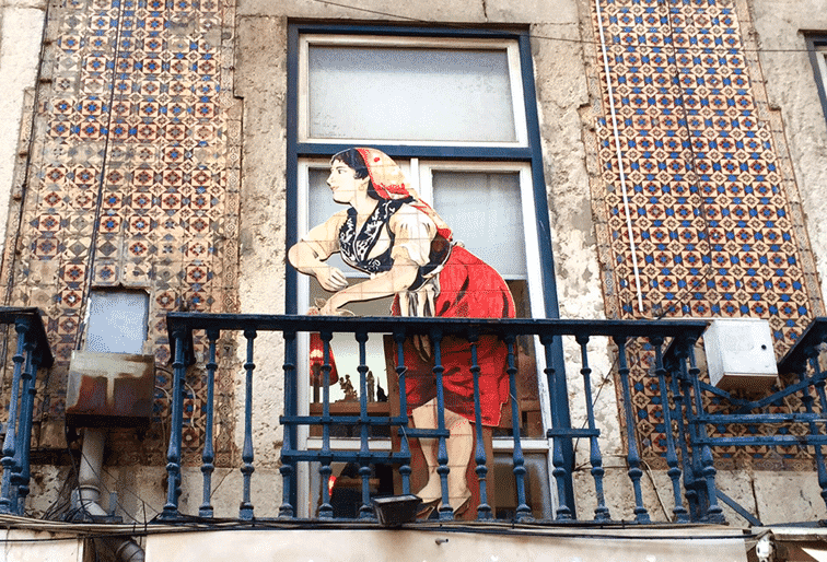 お店の商品ばかりに気に留めないで、風景もしっかり楽しんで歩きましょう。ふと見上げると、かつての看板でしょうか「バイシャ・ガール」と呼ばれている素敵なお嬢さんが。何十年前も前からここにいるのでしょう、モザイクタイルの建物と相まってリスボンらしい可愛らしさです。
