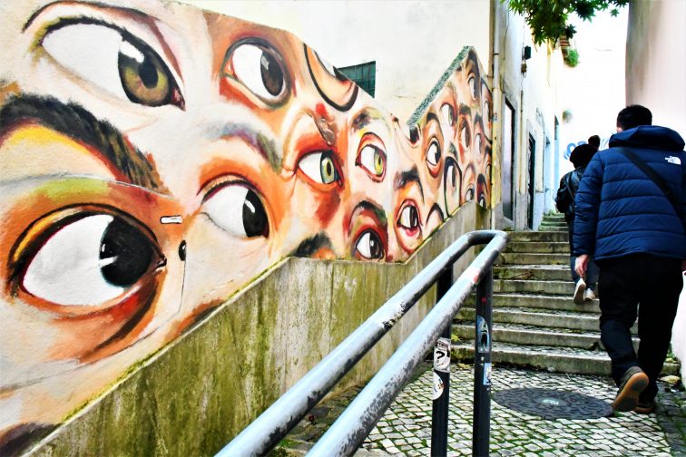 たくさんの目に見つめられながら歩きます。リスボンの道の壁にはどうしようもない落書きも多いけれど、こういった素晴らしいウォールアートに出会うことも!探して歩けばこれもまた楽し・・・です。