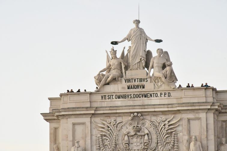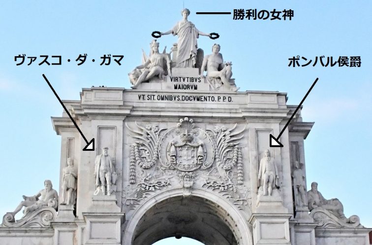 勝利のアーチの頂上には勝利の女神、その下にはポルトガル王室の紋章。左に大航海時代の偉人ヴァスコ・ダ・ガマ、右にリスボン大震災の復興を指揮したポンバル侯爵の像があります。