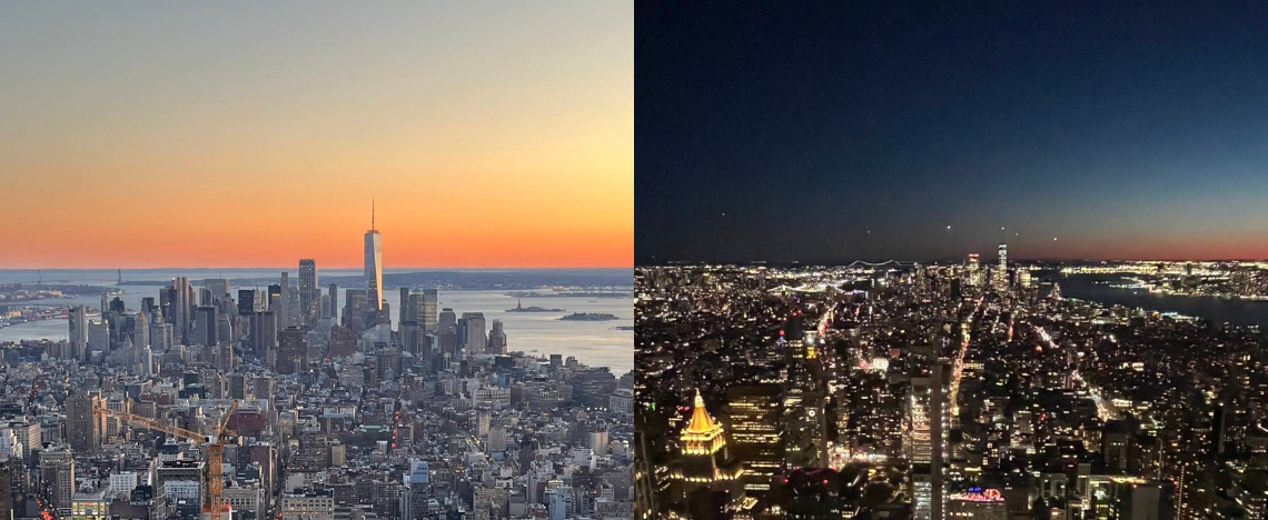 夕方には予約していたエンパイアステートビルの展望台へ。夕暮れから夜にかけての景色を楽しみました。遠くに自由の女神も見え、素晴らしい眺望でした。展望台は一度入場すれば好きな時間まで滞在できるようなので、夕暮れから夜景へと移り変わるマジックアワーをゆっくりと楽しむことができました。