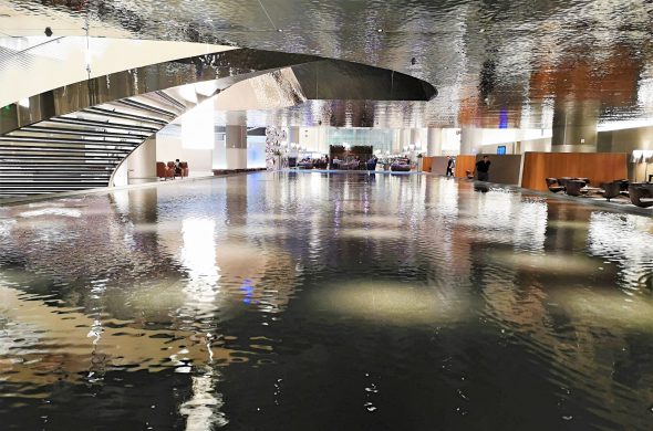 しかも乗り継ぎのドーハ空港で使えるカタール航空ビジネスクラスのラウンジが、アラブの石油王そのもののゴージャスさで、笑ってしまうほどの非日常感!一面水が張り巡らされ、噴水ショーまで行われるというから、一生に一度でもいいから見ておいた方が良いと思います。