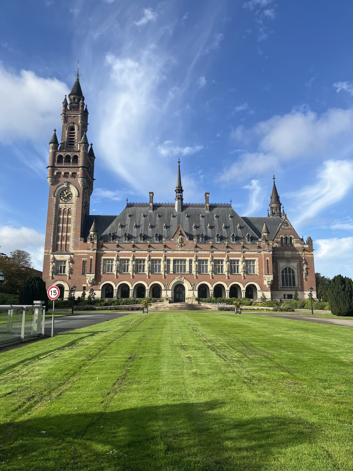 「国際刑事裁判所」に行き、刑事裁判を傍聴しました。前日に行った国際司法裁判所とは別の場所にあり、外観の雰囲気も違ったのが印象的でした。
