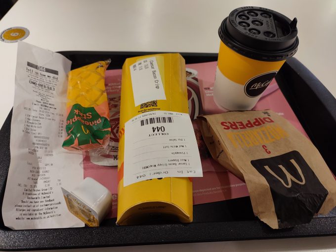 この日の夕食はマクドナルドで。現地のメニューが楽しみで行ってみました。イギリスではラップサラダのメニューが充実していて、パイナップルバー、チーズポテトスティックなど、日本では見かけないメニューもちらほら見かけました。それに、コーヒーのメニューも豊富。普通のコーヒーやカフェラテの他にも、エスプレッソやヨーロッパで人気のフォームミルクとの組み合わせもあり楽しめました。