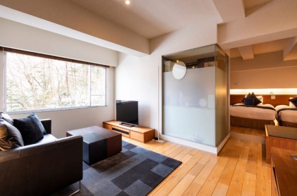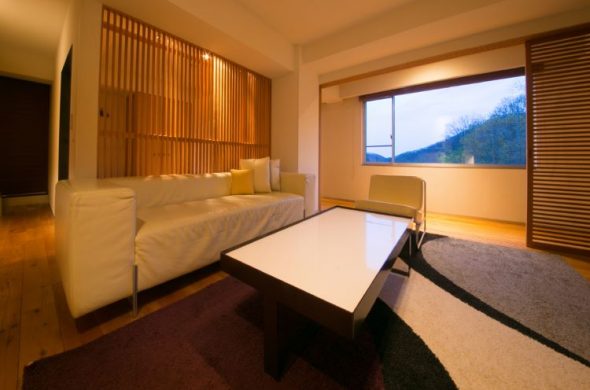 廊下を抜けて目に入ってくるのは、スタイリッシュなデザインのなかに、ホッとするような和の温かさが融合した「和モダン」な空間。随所に飾られたアートや、人が心地よく滞在できるように窓の重心を下にしたデザインなど、隅々までこだわりが光ります。12歳以下は宿泊不可という、まさに大人だけに許された隠れ家です。