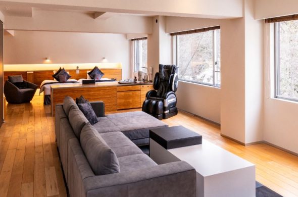 ツインは、和室がない分リビングエリアがより広いのが特徴です。備えられたマッサージチェアに座りながらウトウトするのもよし、大きなソファでくつろぐのもよし、ゆったりとした空間で贅沢なひとときを過ごすことができます。