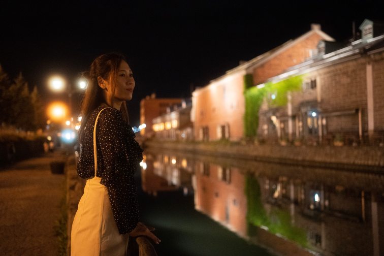小樽の象徴「小樽運河」が一番美しいタイミングは夜!運河沿いには63基ものガス灯が設置されており、石造りの倉庫が優しく照らされます。倉庫群が鏡のように水面に写り、幻想的な光景になります。