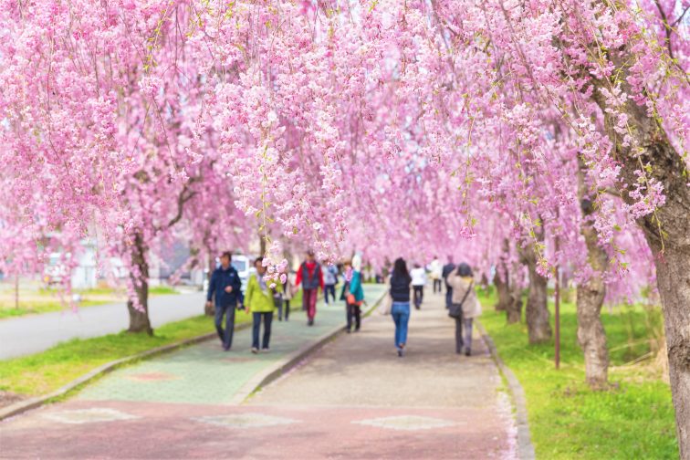福島県は古くから全国的に知られた桜の名所が多く、鶴ヶ城や三春滝桜など数百年前から愛されてきたお花見スポットが常に上位にありましたが、ここ数年、福島県のお花見スポット人気1位、全国的に見ても上位にランクインしているのが喜多方市にある旧国鉄日中線跡地のシダレザクラ。福島県内でも他にない壮大なスケールの桜並木だと高評価。シダレザクラはソメイヨシノよりも約1週間程度開花が早く、福島県のソメイヨシノのピーク時とは少々ずれが生じます。福島県にはシダレザクラの名木も多いので、シダレザクラのお花見を楽しむ旅を計画しても良いかもしれません。