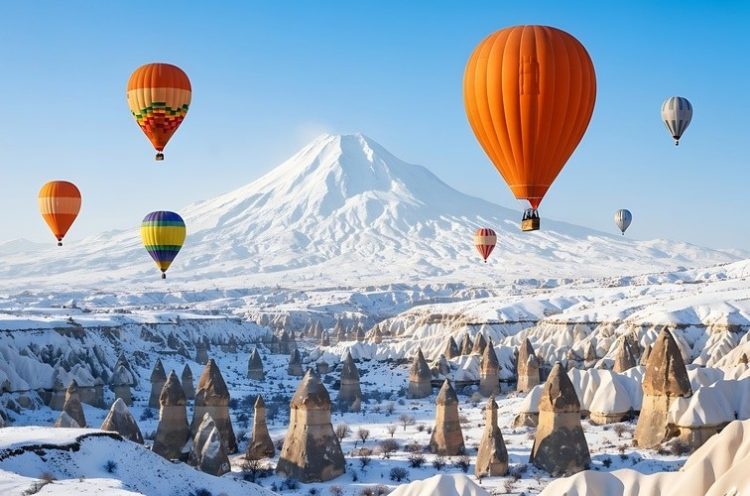 冬季は気球ツアーが天候により中止になることもありますが、雪景色のカッパドキアも幻想的で美しいです。ギョレメ野外博物館やウチヒサール城塞など、見どころも豊富です。所要日数は5泊6日程度で、費用相場は約15万円から22万円です。