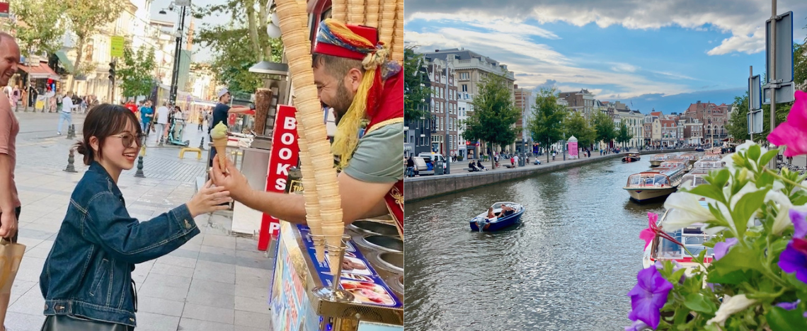 ホテルにチェックインを済ませた後は、早速街を散策。日本ではなかなか手に入らない英蘭辞典やオランダ語の本を探しに書店へ向かいました。ここでも日本文学や日本文化が人気なようで、『吾輩は猫である』や『IKIGAI(生き甲斐)』がベストセラーの棚に並んでいるのを見て嬉しくなりました。書店を出てからは、ちょうど夕暮れが綺麗な時間帯だったので、休憩がてら運河沿いのカフェでビールを一杯。17世紀の面影が残る街並みは、全体が世界遺産に登録されているだけあって本当に綺麗でした。