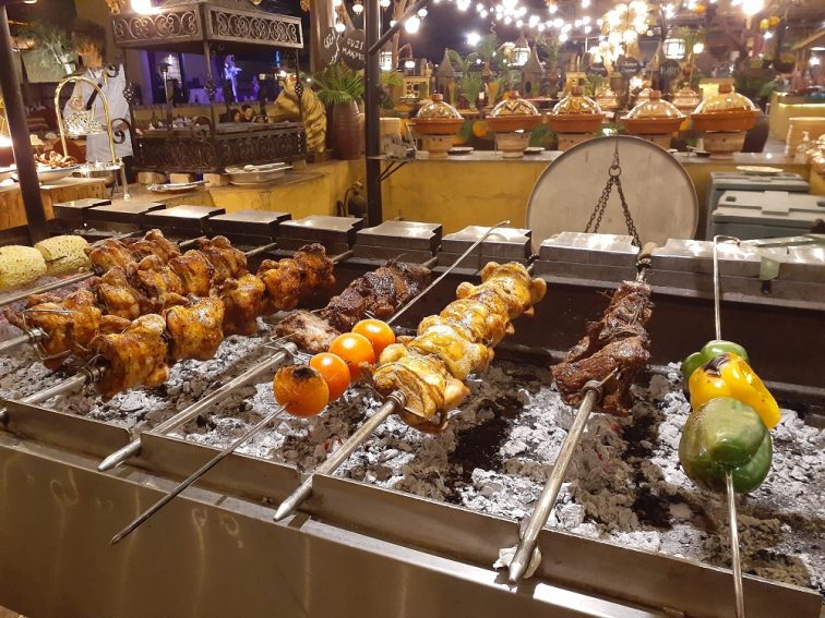 普通は休憩を取りながら1時間に1、2本ショーがある程度だと思いませんか?それは大きな間違い。オープンしてからひたすらアラブのうねるような曲調の歌を生ライブで聴かせていると思っていたら,、それはほんの場つなぎでダンス、寸劇、イスラム圏伝統の曲芸など、出るわ出るわ・・・。はっきり申し上げると、会話はできない頻度です。ということで、ここは完全なシアターと割り切り、会話ではなく食とエンターテインメントに集中しましょう。そう、決意するほどショーがひたすら続くサービスぶり。