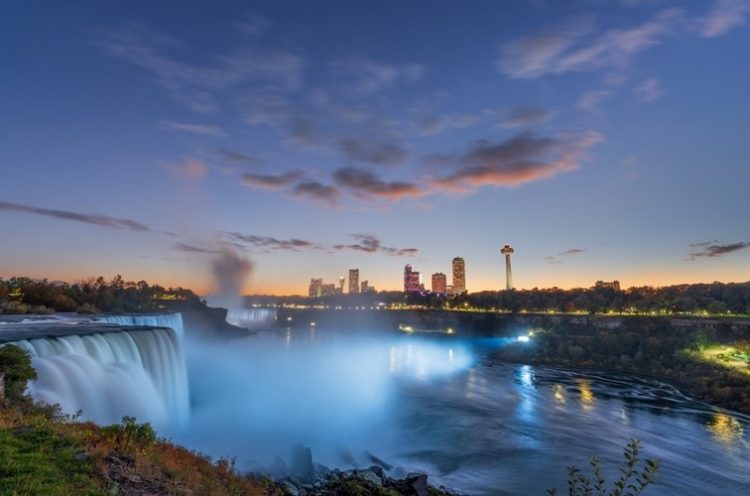 日中:ナイアガラの滝観光 ナイアガラの滝はアメリカ側よりもカナダ側、特に6~8月は水量が多く迫力があります。天気が良ければ滝にかかる虹を見ることができます。冬の時期は凍った氷瀑の美しさも格別です。